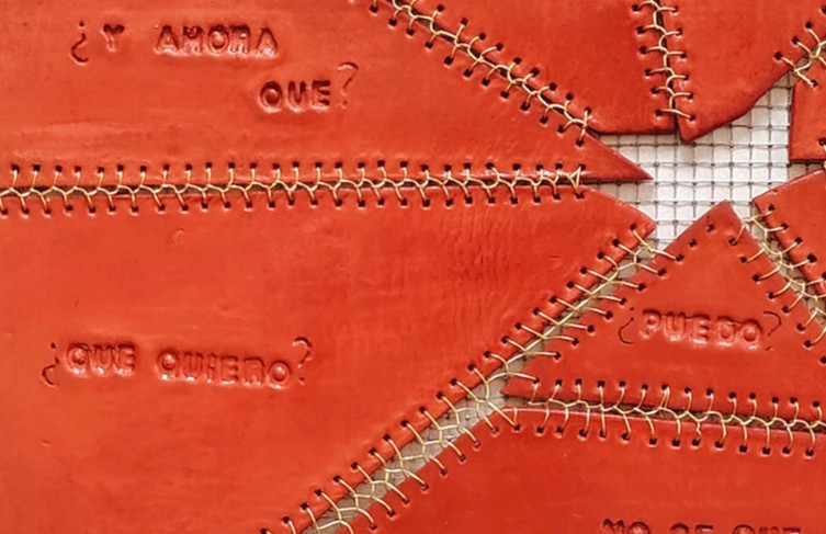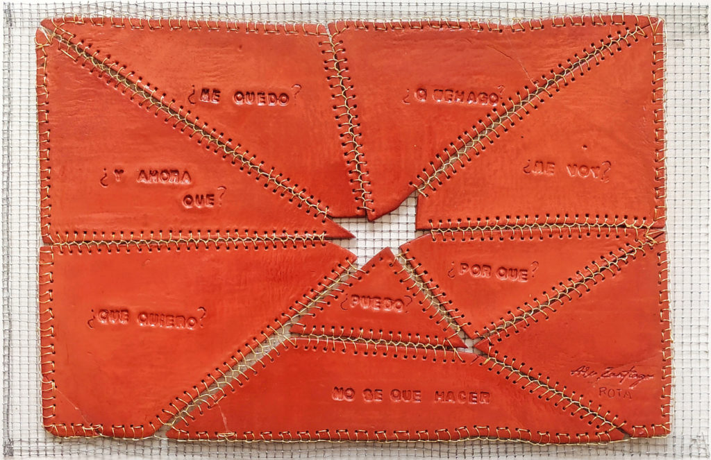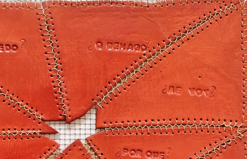 Una placa fracturada, un cuerpo dividido que, pese a todo, no se rinde a su ruptura. Los trozos han sido unidos con puntadas de alambre, como cicatrices visibles que no ocultan el quiebre, sino que lo resignifican. Esta unión también afianza los trozos sobre una malla metálica: un entramado que contiene, sostiene y delimita. Inscritas en cada fragmento aparecen preguntas que nos acechan en momentos clave: ¿Por qué? ¿Puedo? ¿Qué hago? ¿Me voy? ¿Me quedo? ¿Qué quiero? ¿Y ahora qué? Interrogantes que emergen desde la incertidumbre, actuando como límites invisibles que nos fragmentan interiormente. Cada duda abre una grieta. Pero al verbalizarlas y enfrentarlas, se convierten en el hilo —en este caso, metálico— que nos cose y nos recompone. Esta obra reflexiona sobre los límites autoimpuestos: cómo las dudas nos rompen, pero también cómo, al atravesarlas, construimos puentes que reconfiguran nuestra identidad. Así, lo que fue ruptura se transforma en unión, y lo que parecía límite se convierte en parte del camino.