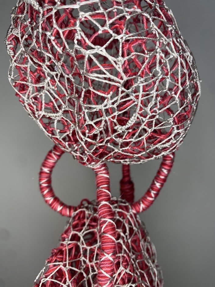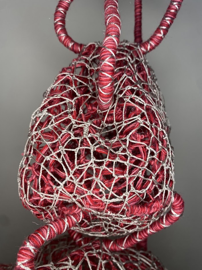 La escultura textil presenta 3 formas orgánicas de dimensiones distintas, que sugieren cuerpos celestes u organismos vivos, interconectadas por cordones que fluyen entre ellas como venas o hilos de comunicación. Sus colores en tonos rojos y gris metálico evocan vida y sangre, al mismo tiempo que remiten a lo cósmico, a lo desconocido. ¿La conexión que proporcionan los cordones es realmente capaz de transmitir? ¿De intercambiar? ¿Hasta qué punto nos comunicamos? La pregunta/título de la obra cuestiona el límite entre los seres, entre el uno y el otro, ya sea afectivo, racional, trascendental…