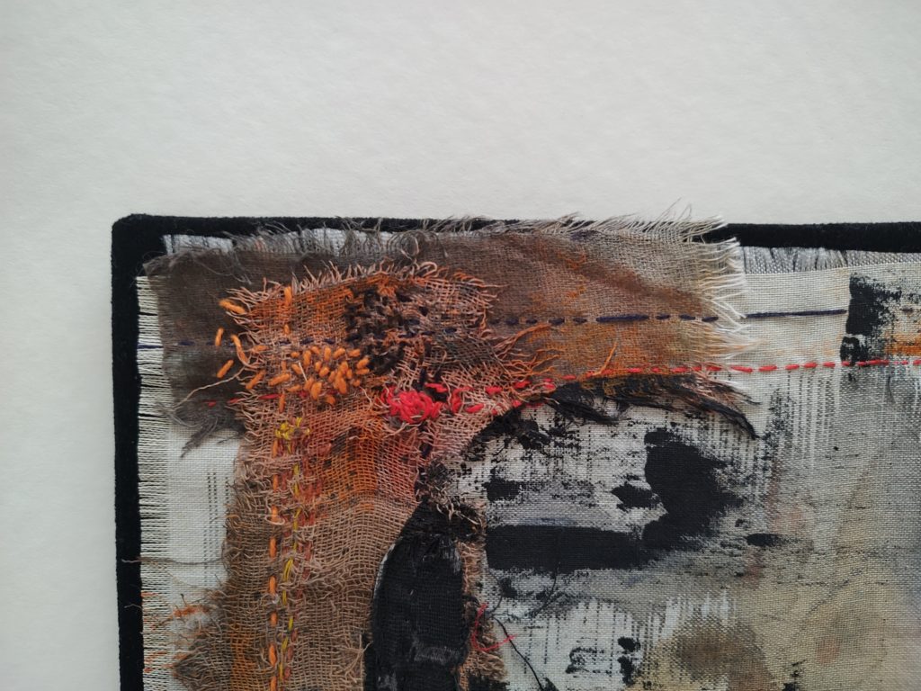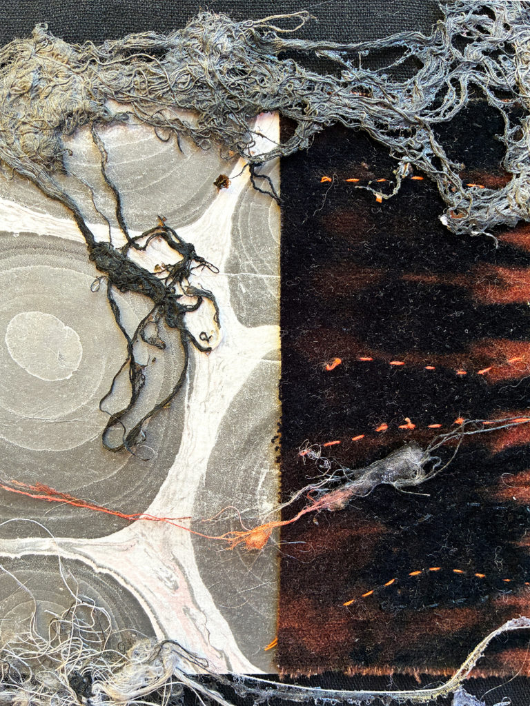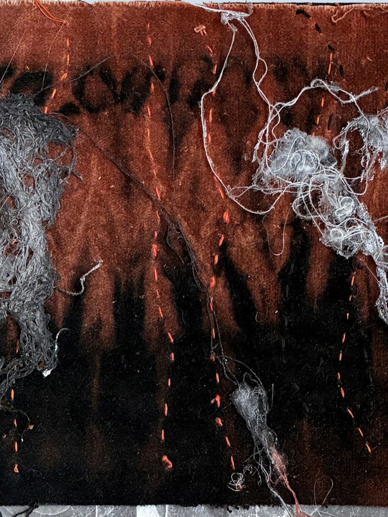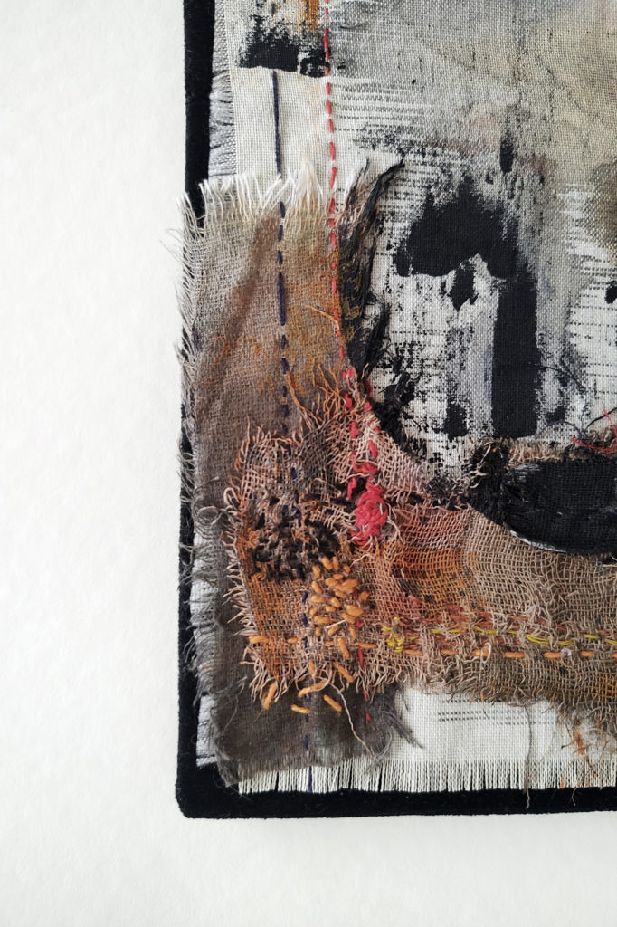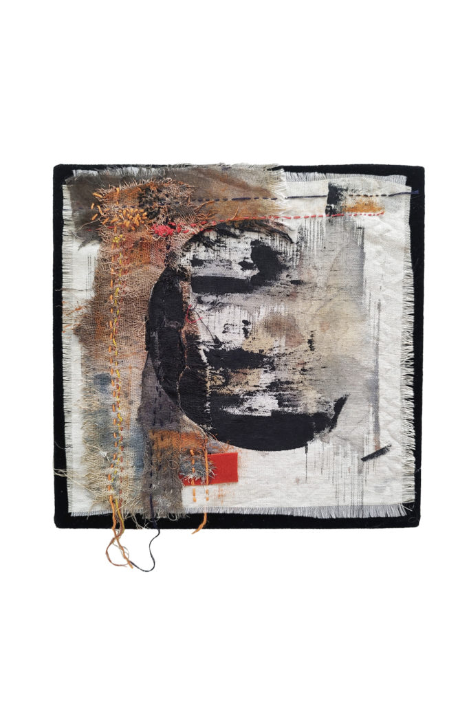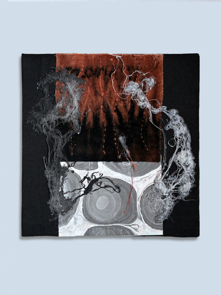 Técnica: Base de madera entelada en lino negro. Terciopelo y lino teñidos y decolorados con diversas técnicas de Shibori. Bordados espontáneos con hilos de algodón. Papel de arroz intervenido con técnica de Suminagashi en tintas negras. Elementos escultóricos realizados con hilos de algodón y estopa, teñidos y tratados con diversas técnicas para lograr una apariencia etérea.