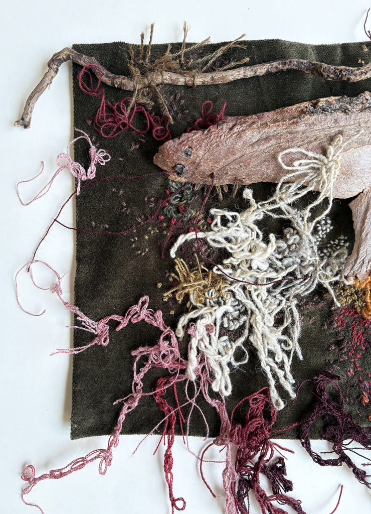 Materiales: Lana natural hilada por artesanos de los Andes peruanos, teñidos artesanales, corteza de madera natural y tela como soporte