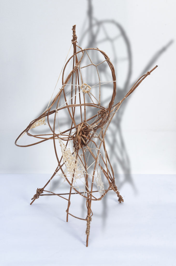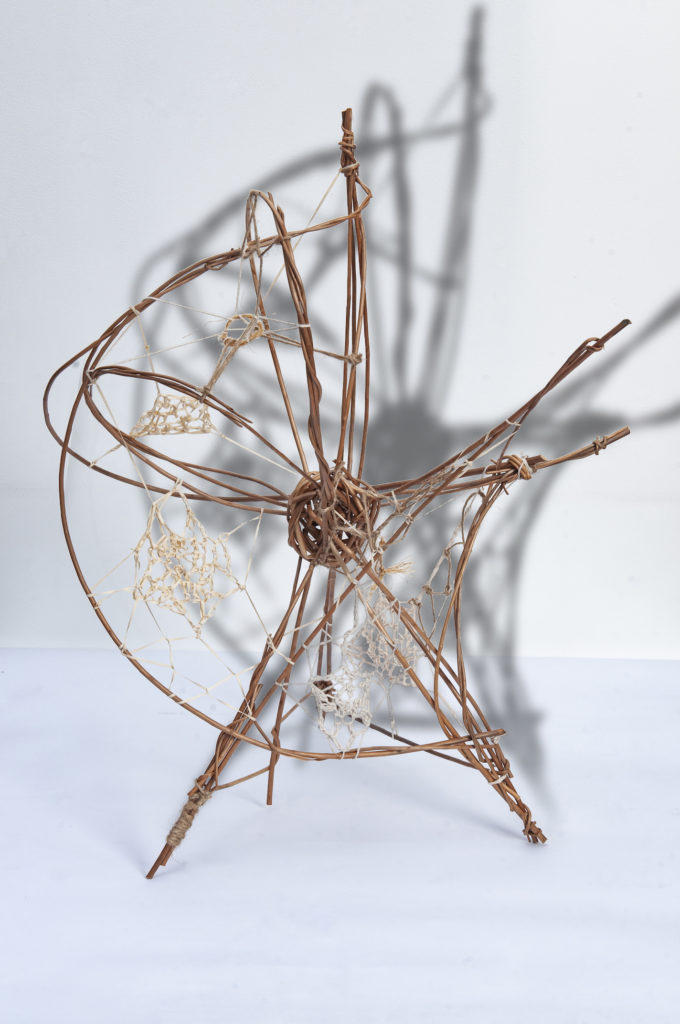 Encuentra los límites en el espacio, al trenzar, cruzar e hilar materialidades como el mimbre, y tensar diferentes textiles, creando espacialidades. Tomo distancia y encuentro mis propios espacios en mi ser interior, que se ve reflejado en la tridimensión. En las fotos de la obra están presenten las sombras que se proyectan, como parte de la ella, ese espacio hilado queda proyectado, espejando esta creación textil.