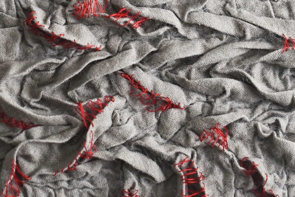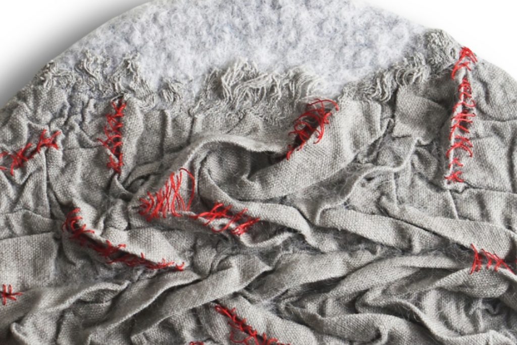 El Kintsugi, “reparar con oro”, celebra las fracturas como memoria luminosa. En Kintsugi Textil traslado esa filosofía a la fibra: no con oro, sino con hilo rojo vibrante que recorre pliegues y grietas del lino y el fieltro, resaltando lo que suele ocultarse. La obra indaga en los límites entre fragilidad y fortaleza, donde la herida deja de ser ausencia para transformarse en fuerza y en posibilidad de belleza.