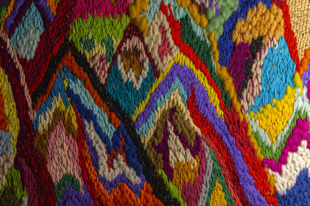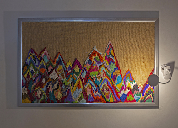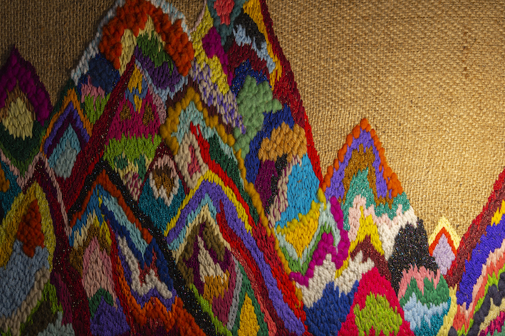 En esta pieza se condensan aspectos de carácter autobiográfico y temas que están presentes en toda mi obra. Por una parte, se muestra una versión de la Cordillera de los Andes inspirada en los viajes de ida y vuelta que realizo a Chile, mi país de origen. Fue bordada sobre un saco de yute, sin patrón de dibujo previamente marcado, con hilos y lanas de múltiples colores y texturas que se agregaron de manera gradual y en un acto intuitivo de combinaciones cromáticas durante el proceso. A su vez, el saco de yute refiere a la tradición arpillera chilena, un arte popular relacionado a la memoria histórica de mi país. Por otra parte, la cordillera representa la naturaleza fértil y las riquezas tanto espirituales como energéticas que hay en su geografía, que, en su contraparte, son saqueadas con fines económicos, despojándola de su importancia ritual para las culturas ancestrales que se han desarrollado a sus faldas, la han honrado desde hace siglos y se han maravillado con su presencia colosal.