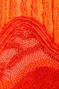 Materiales: Vivo, bies y cordón procedente de residuos industriales textiles. Hilo perlé de algodón de segunda mano. Hilo de bordar.